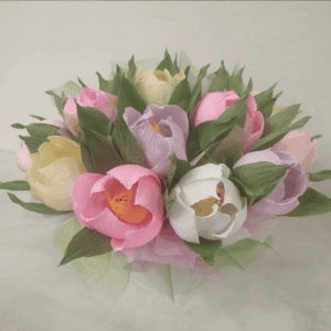 Мы изготовим для Вас букет из конфет недорого из искусственных роз, тюльпанов, астр, пионов, подснежников, хризантем, крокусов, васильков, ромашек, подсолнухов.