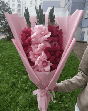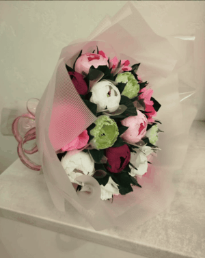 Во всех наших сладких, съедобных букетах из конфет присутствуют искусственные цветы, изготовленные из гофрированной бумаги, с вложенными внутрь их сладостями (Золотая лилия, Рафаэлло, Марсианка, Чупа Чупс, шоколада, батончиков) на деревянных шпажках по заказу клиента, которые, гармонично сочетаясь, превращаются в шикарный съедобный подарок для человека любого возраста.