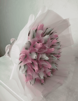 Букеты из рукотворных цветов в последнее время стали серьезными конкурентами, экстравагантным подарком и заменой обычным живым цветам. В сравнении с живыми цветами Вы можете любоваться ими долгое время, они не испортятся за пару дней, не завянут на следующее утро. Им не нужен уход и замена воды каждый день. После того как из них извлечь сладости аккуратно без повреждения бумаги, можно использовать для украшения интерьера, что многие и делают. А еще глядя на них вспомнятся воспоминания о веселом прошедшем празднике или серьезной памятной дате, к которой Вы не безразличны и когда-то весело отметили с друзьями.